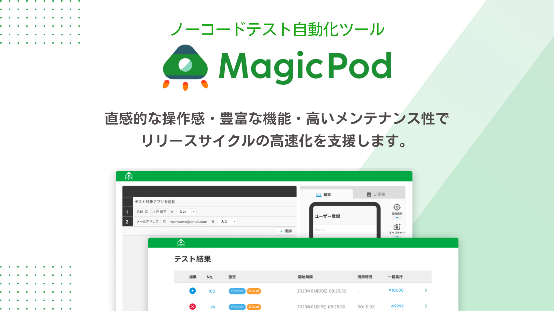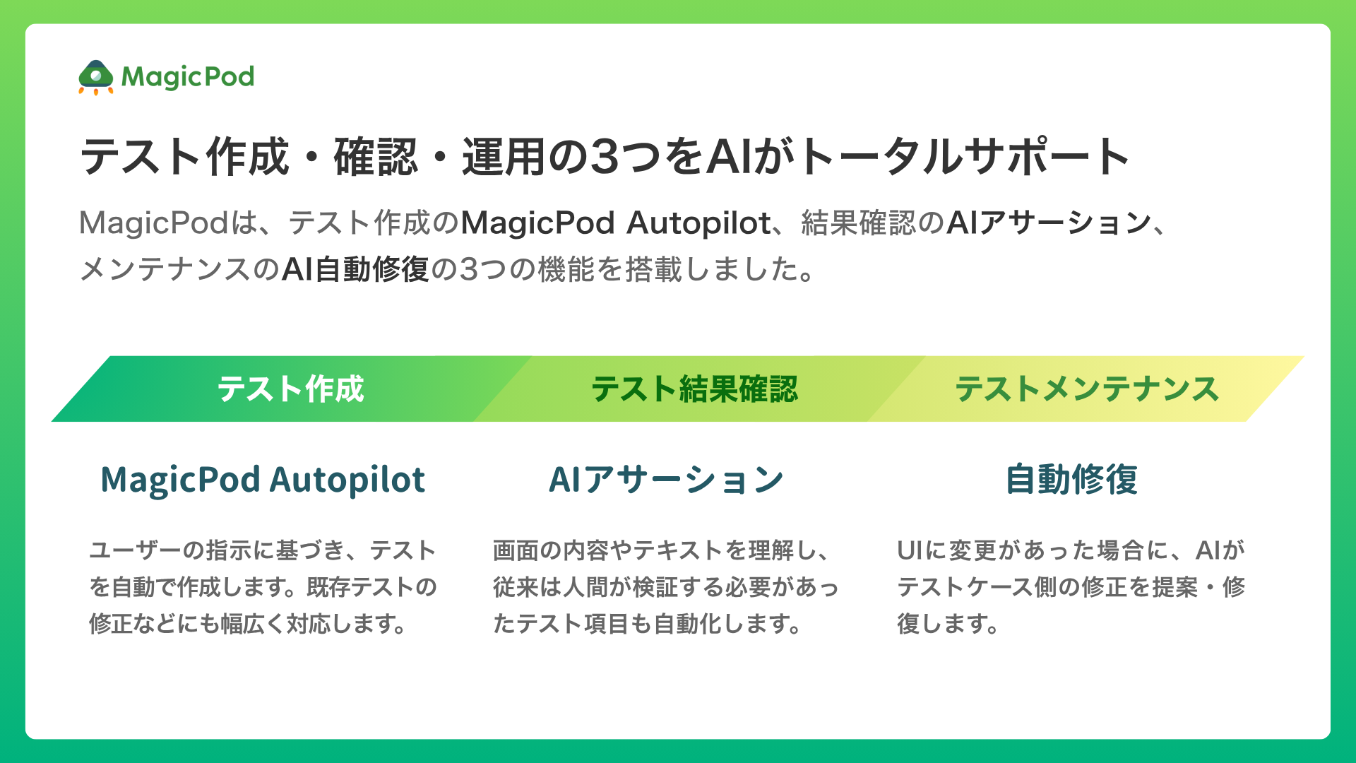 その負担を軽減しようというのがMagicPodの使命です。AIを活用することで、自動化するテストの設定自体を簡単に作成でき、運用コストを抑えながら高い品質を維持できます。