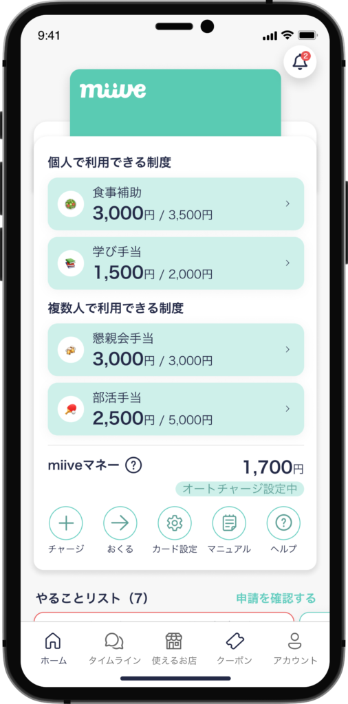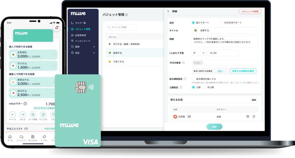 miiveは、Visaネットワークを活用した福利厚生カードを提供しています。 企業が導入したい福利厚生を「ポイント」を使って自由に設計し、従業員はカードを使い、手軽に会社の制度を利用できます。