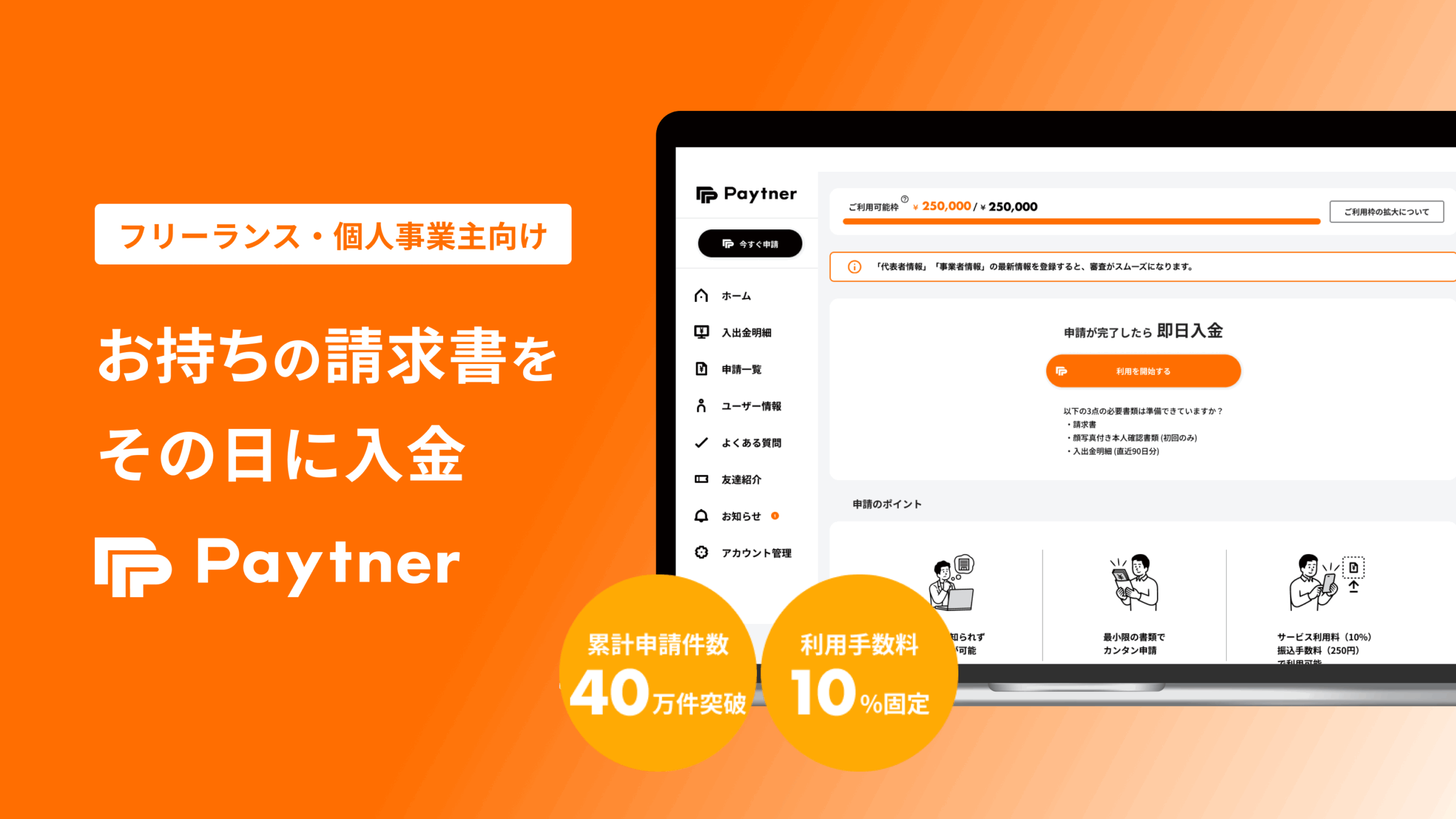 ペイトナーは、フリーランスや個人事業主の方向けに「オンライン型ファクタリングサービス」を提供しています。ファクタリングとは、本来であれば数十日後に入金される請求書(売掛債権)を、事業者が金融機関などに売却することで、すぐに現金化できる仕組みのことです。私たちのサービスでは、この手続きをすべてオンライン化し、最短で申込日即日の入金が可能となっています。